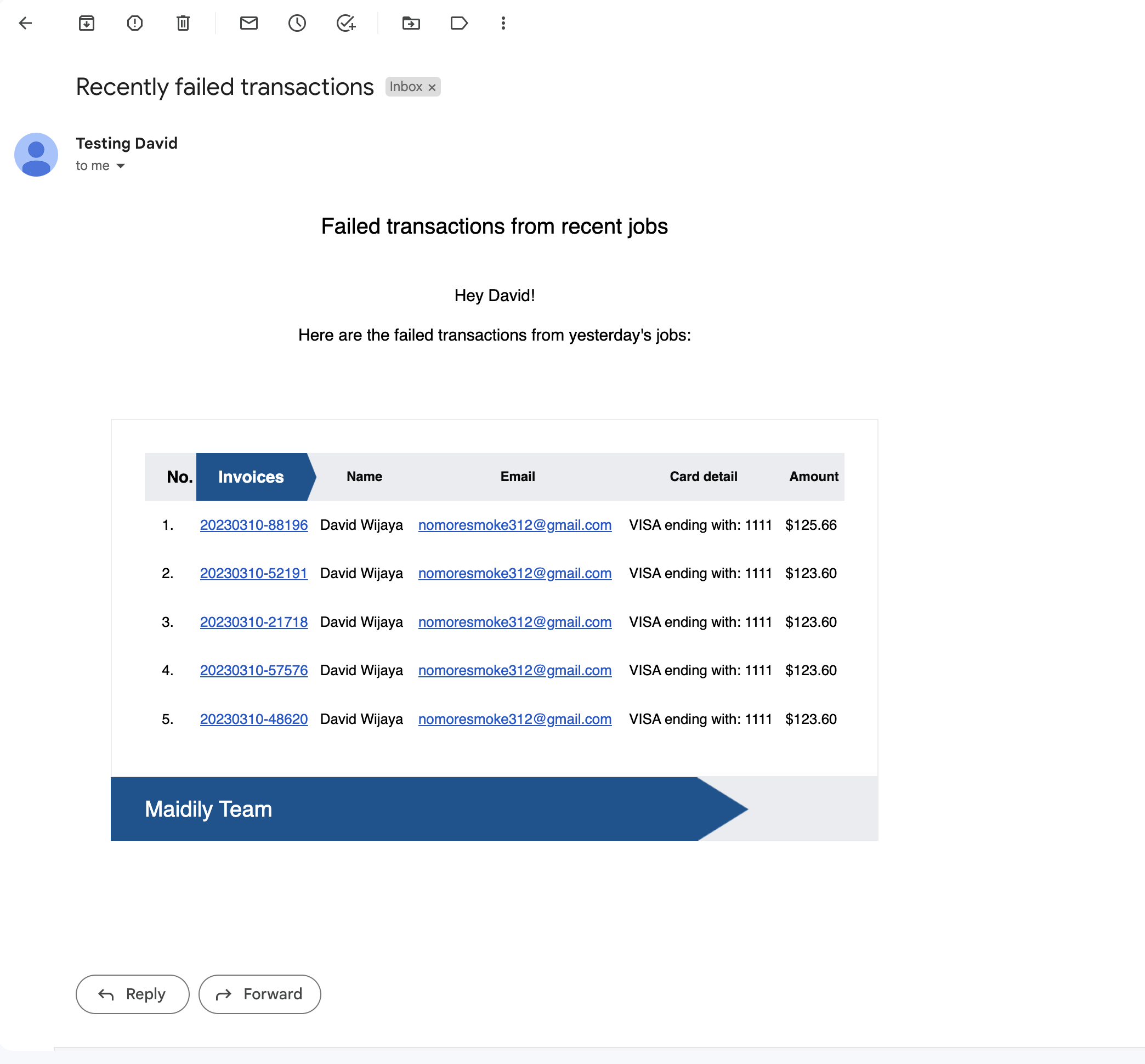 Any jobs with a card selected as the payment method that fail to be charged (ex. insufficient funds, expired card, etc) will be sent to you as an email summary the following morning (next day after the charge is attempted)