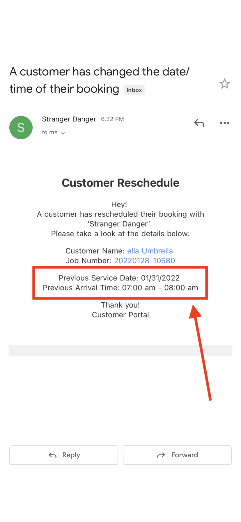 - You will receive a reschedule email (not in our templates library) if a customer reschedules the job - the email will contain the old date and time of the previously scheduled job